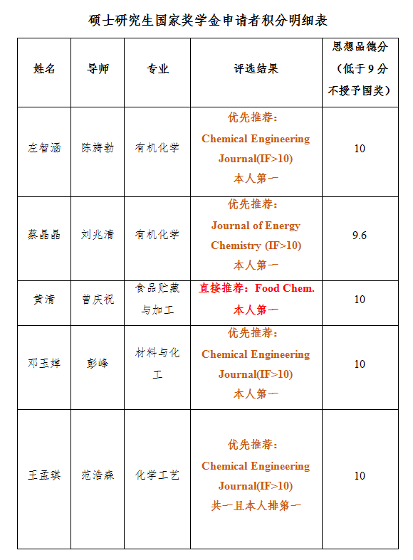 研究生奖学金评审委员会评审,拟推荐左智涵(20有机化学)、蔡晶晶(20有机化学)、黄清(20食品贮藏与加工)、邓玉婵(20材料与化工)、王孟琪(21化学工艺)5位同学为2022年禁漫天堂