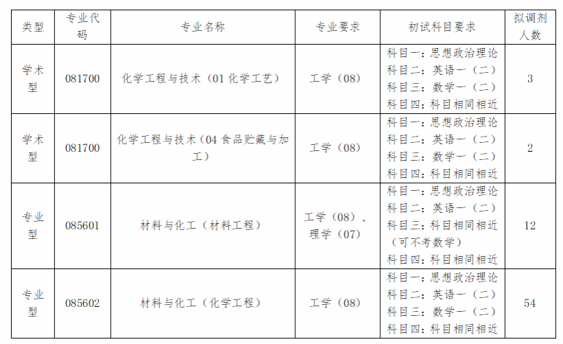 3. 考生初试科目应与调入专业初试科目相同或相近,全国统一命题科目必须一致。第一志愿为材料科学与工程(0805)、化学工程与技术(0817)、轻工技术与工程(0822)、环境科学与工程(0830)、食品科学与工程(0832)、生物工程(0836)、材料与化工(0856)、资源与环境(0857)、生物与医药(0860)等相关专业背景的考生将优先考虑。
