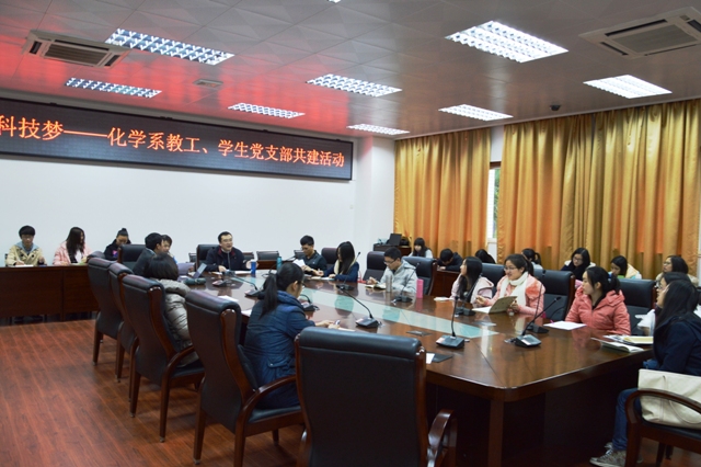 化学系师生党员共建活动之“中国梦,科技梦”科研交流会在生化楼会议室举行。化学系教工党支部和学生党支部党员30人参加了这次活动。