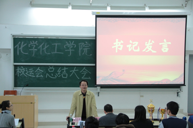 最后,谭书记就本次校运会工作致辞。谭书记总结了校运会历史性的突破、感动于同学们辛勤的付出、思考了校运精神在日常学习生活中的发扬,在场同学受到了深深的鼓舞和启迪。谭书记希望化院的学子在今后的学习永远发扬团结、拼搏、奋发、努力的化院精神,遇到困难不服输,为自己的将来奠定更好的基础!