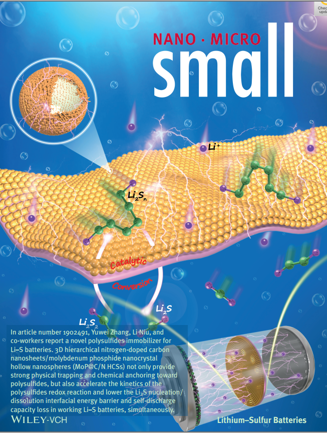 分析科学技术研究中心牛利教授团队,通过有机-无机杂化策略成功将三维氮掺杂碳纳米片/磷化钼纳米晶中空纳米球修饰到商业化电池隔膜上,用来解决锂硫电池存在的多硫化物穿梭和自放电的问题。该修饰隔膜不仅可作为多硫化物的固定剂对多硫化物提供强烈的物理、化学吸附,而且也可以作为电催化剂用来加快多硫化物之间快速的相互转化,并且能够降低硫化锂的形核/溶解界面能、抑制电池的自放电行为。该研究成果以封面论文的形式发表在Small上(IF=10.85),张玉微教授、牛利教授为改论文通讯作者,禁漫天堂