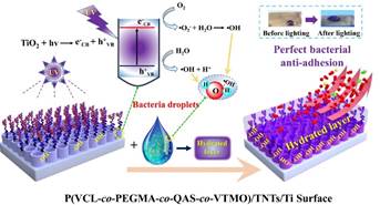 抗细菌黏附热响应增强技术:研究发现设计调控钛基复合材料P(VCL-co-QAS-co-PEGMA-co-VTMO)/TNTs/Ti表面的聚合物链的相转变温度,低温环境可实现抗细菌黏附热响应增强效应(图1);