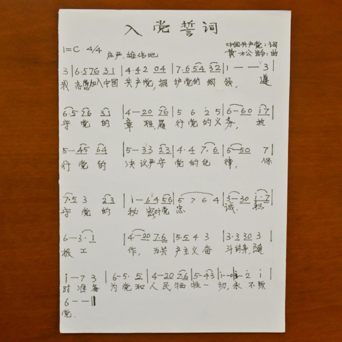 退休后,他在家仍坚持写歌谱曲,创作内容多为抒发爱国爱党情怀。建党百年之际,黄老师还特意为中国共产党的入党誓词谱曲。他现场简单唱了一遍谱,我们静静听着,不觉已沉浸在旋律中。