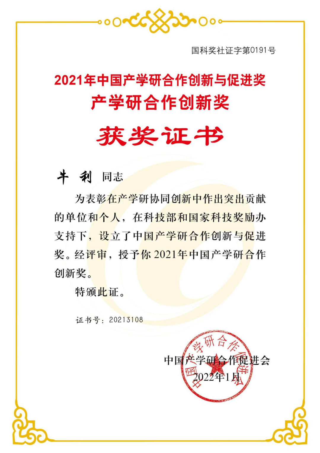 牛利老师荣获2021年产学研合作创新奖(个人)、禁漫天堂