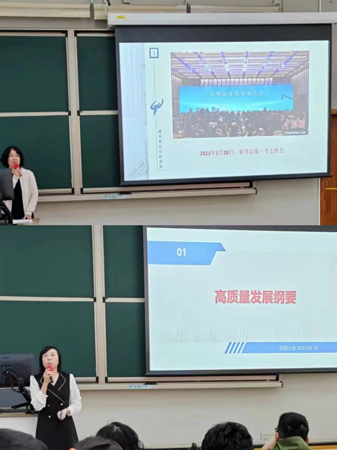 为了深入学习宣传贯彻党的二十大精神,以及省、市高质量发展大会精神,以新姿态、新气象推进学院事业高质量发展,2月15日下午,学院党委理论学习中心组召开学习会,认真学习省、市、学校高质量大会精神,中心组成员结合自身岗位职责,畅谈学习体会,为学院党建、教学、科研、人才培养等事业高质量发展出谋划策。2月16日,学院召开新学期第一次全院大会,会上学院党委周海兵书记向全体老师传达了省、市高质量发展大会的精神,韩冬雪院长传达了学校高质量发展大会精神,用详尽的数据分析了学院各项事业高质量发展的现状、差距,并指出了学院高质量发展的方向。