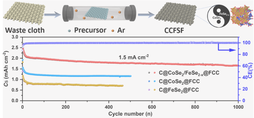柔性准固态钠离子电池以其低成本、高安全性和优异的机械强度吸引了可穿戴电子设备领域的广泛兴趣。然而,这种电池的开发面临着巨大的挑战,包括构建界面相容的柔性电极材料和解决电解质的高安全需求。本工作采用一步超快、无溶剂的微波热解方法,提出了一种硒空位调控的双金属硒化物异质结作为柔性负极材料,该异质结固定在具有坚固界面C-Se-Co/Fe化学键的废棉布衍生的柔性碳布上。富硒空位和CoSe2/FeSe2-x异质结构同步形成,可以显著提升钠离子和电子扩散动力学行为。此外,在硒空位异质结构的表面上均匀的碳层赋予它卓越的结构稳定性,因此在1000次循环后,在1.5 mAh cm-2 的电流密度下可以获得1.65 mAh cm-2 的高可逆面容量。柔性正极也通过在FCC上直接生长普鲁士蓝纳米颗粒来制备。此外,通过耦合CCFSF负极,PB@FCC正极与凝胶聚合物电解质,组装了先进的柔性准固态钠离子软包电池,该全电池不仅表现出优异的储能特性,而且具有强大的机械灵活性和安全性。本工作为实现高安全性的柔性储能设备提供了一条有效途径,促进了柔性可穿戴电子设备的发展。