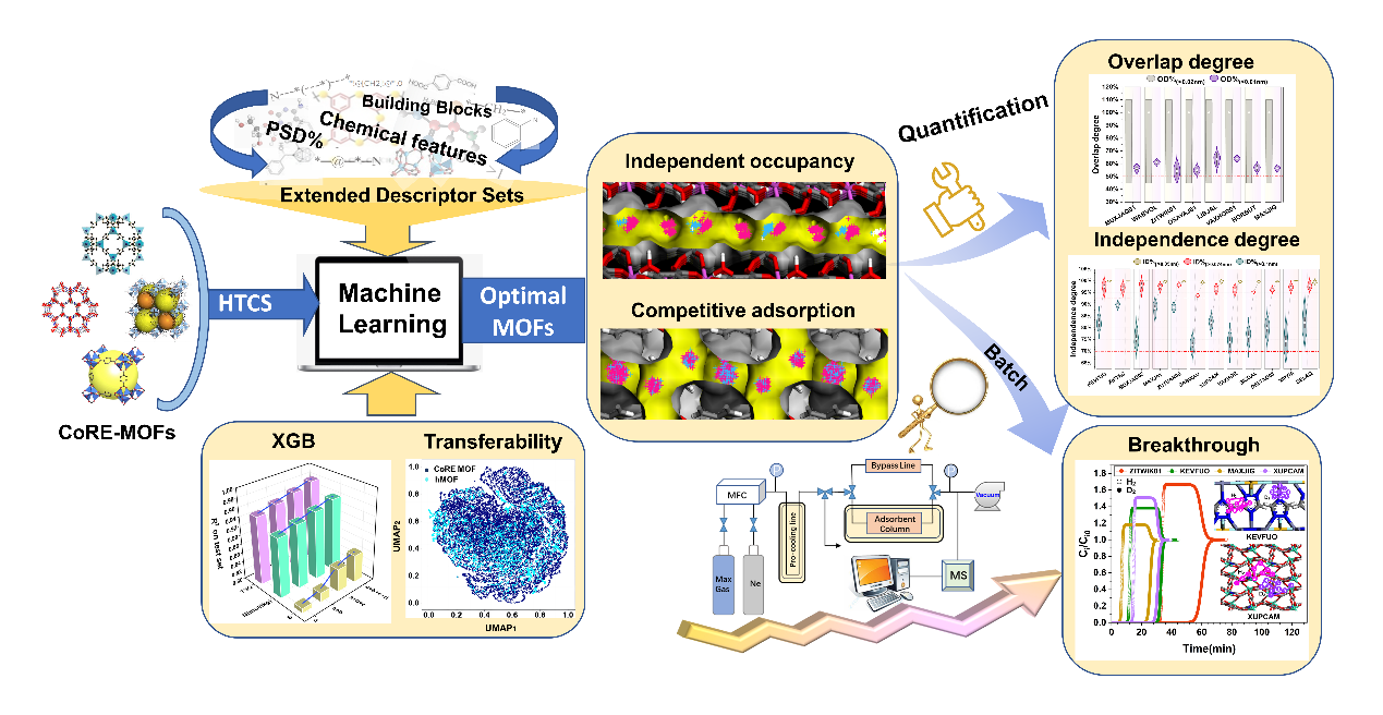 该工作利用机器学习辅助的高通量计算,筛选了对D2/H2具有优异动态吸附分离性能的MOFs。通过大数据挖掘,对筛选出的最优MOFs的吸附机理进行了探究,发现存在独立占位和竞争吸附两种吸附行为,其中独立占位现象更为突出。随后,提出了重叠度(OD)和独立度(ID)两个概念对这两种吸附行为进行量化,并制作了一款可快速计算材料OD和ID值以判断其吸附行为的软件(访问链接://github.com/LyuCindy/InDePendenceDegree_OverlapDegree_Software.git)。此外,通过python语言自开发了可批量计算多元气体混合物穿透曲线的程序包(访问链接://github.com/e123st/Breakthrough_Time_identification-master/),并模拟了2000个性能较优MOFs对D2/H2的穿透曲线。以穿透时间之差(ΔT)作为指标来衡量MOFs的动态分离性能,发现在LCD为近两倍于D2动力学直径时出现的“第二峰”与具有独立占位现象的Type Ⅱ孔道(两侧具有窄孔的圆柱孔道)的存在,更有利于MOFs实现良好的D2/H2动态分离性能。该研究成果为设计具有高氢同位素分离性能的MOFs提供了新的思路和有利的工具。