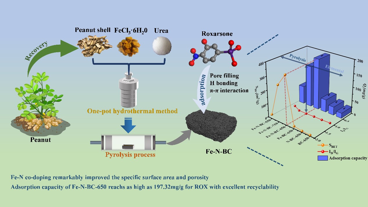 该研究团队以废弃的花生壳、FeCl3·6H2O和廉价的尿素为原料,采用一锅水热法、经热解制备了铁氮共掺杂的生物炭(Fe-N-BC),系统研究了铁氮共掺杂对生物炭的理化性质和对ROX吸附性能的影响。研究发现,在650 ℃的热解温度下,Fe-N-BC-650的比表面积显著增加,达到358.53 m2/g,并且具有发达的微介孔结构。在25 ℃条件下,其对ROX的吸附量高达197.32 mg/g,多次吸附-脱附循环后再生效率仍高达90 %以上,表明从废弃的花生壳得到的铁氮共掺杂生物炭在高效去除含ROX废水方面显示出良好的应用潜力。相关分析和光谱分析表明,孔隙填充、π-π相互作用和氢键在吸附ROX过程中起主导作用。