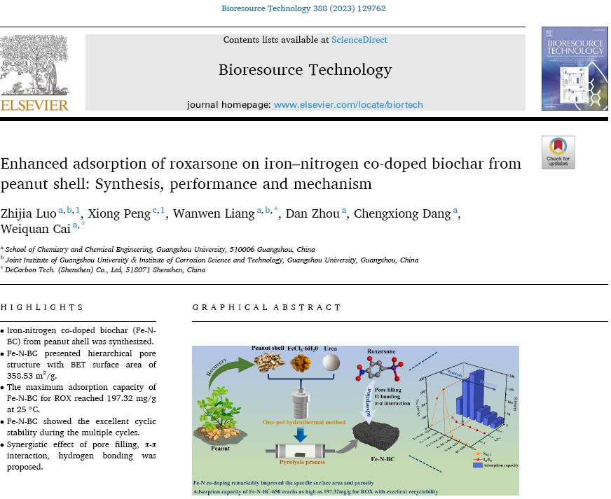 蔡卫权教师团队在工程技术领域著名期刊《Bioresource Technology》(中国科学院大一区,IF= 11.4,Top期刊)发表了题为“Enhanced adsorption of roxarsone on iron-nitrogen co-doped biochar from peanut shell: synthesis, performance and mechanism”的研究论文。该团队梁菀纹博士后和蔡卫权教授为通讯作者,硕士研究生罗志佳为第一作者,禁漫天堂