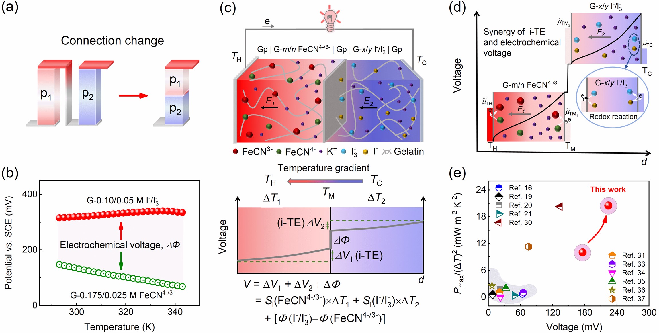 图1. (a)凝胶电池结构变革;(b)凝胶G-FeCN4-/3-和G-I-/I3-的电极电势-温度曲线;(c)i-TE-EC电池在温差下的示意图及电压分布;(d)凝胶内的电压和电荷化学势变化;(d)本工作和报道数据的输出功率密度对比。