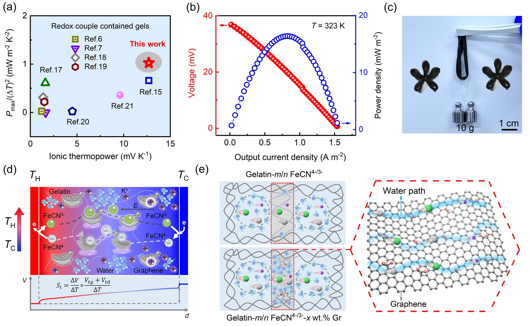 基于前期以第一作者身份发表在Science上的研究工作(Cheng-Gong Han et al, Giant thermopower of ionic gelatin near room temperature. Science, 2020, 368, 1091–1098.),作者设计了一种以Fe(CN)63-/Fe(CN)64-(缩写为FeCN4-/3-)为氧化还原电对的明胶(Gelatin)基离子凝胶热电池,通过引入石墨烯(Gr)优化离子凝胶组成,提高了高温下的离子热电势和输出功率密度。石墨烯形成类似“桥”的水通路,提高了离子扩散系数,同时提高了氧化还原反应的交换电流密度和凝胶的耐热性,从而实现离子热电转换性能的大幅度提升。最终,离子热电凝胶Gelatin-0.04/0.06 M FeCN4-/3--6 wt.% Gr在50℃下获得了高达13 mV K-1的离子热电势,输出功率密度为1.03 mW m-2 K-2,1 h内连续放电能量密度为0.19 J m-2 K-2。此外,由四个凝胶热电池串联组装的柔性离子热电凝胶器件在50℃下实现了创纪录的输出功率密度1.2 mW m-2 K-2。该工作为制造和设计出高性能离子凝胶,尤其是在较高温度下使用的离子凝胶,提供了实验参考和指导。