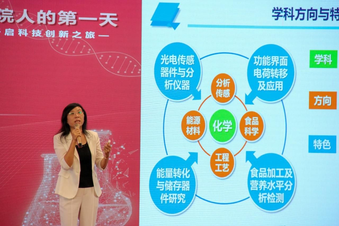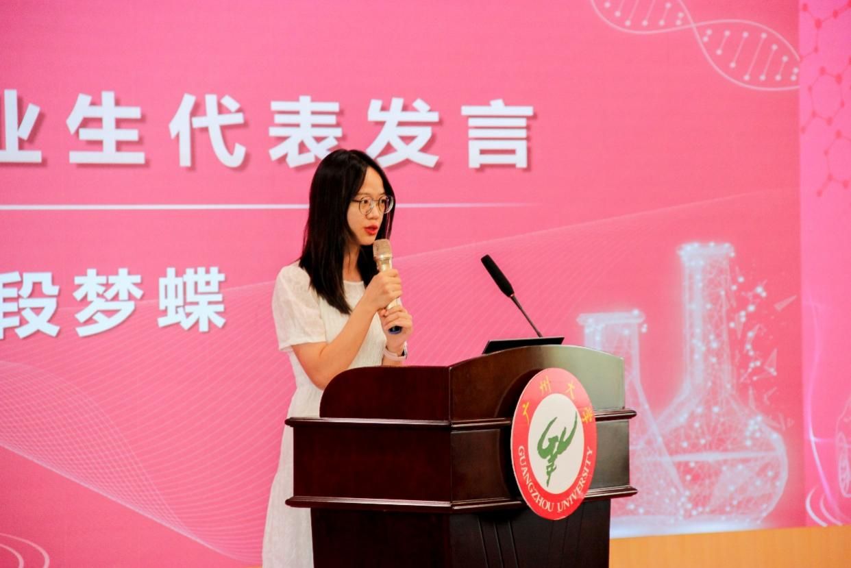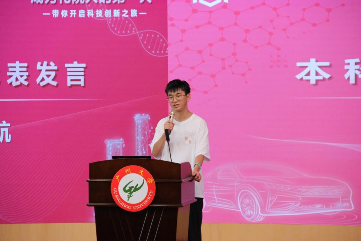 化院优秀毕业生代表段梦蝶(现保研至华南理工大学攻读硕士研究生)表达了对化院老师们辛苦栽培的深深感谢。段梦蝶师姐提到,她在本科阶段选择转专业进入化院,以兴趣为支点,进科研团队,深扎实验室,辅以勤学好练,最终成功深造攻读硕士学位。她叮嘱新生们利用好化院创建的各种优势条件,充实自身能力,为自己的未来奠基。