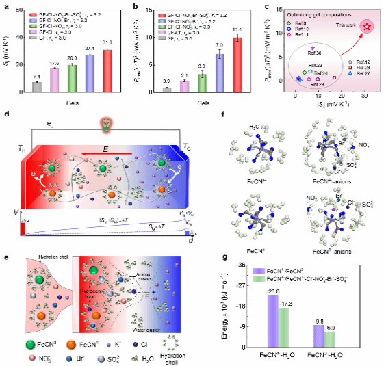 韩成功教授、韩冬雪教授和牛利教授在高熵离子热电凝胶领域取得重要研究进展,在Energy & Environmental Science上发表题为“Remarkable ionic thermoelectric performance of high-entropy gel thermocell near room temperature”的研究论文。本研究通过熵工程调控策略,率先将“高熵”概念引入到离子热电凝胶领域,使离子热电转换性能整体获得大幅度提升。最终,在高熵离子热电凝胶GF-Cl--NO-3-Br--SO2-4中获得了31 mV K-¹的离子热电势,11.4 mW m-⟡ K-⟡的归一化输出功率密度,4.3 J m-⟡ K-⟡的能量回收密度(1小时连续放电)。该研究工作为其他能源类凝胶的性能优化提升提供了重要参考。