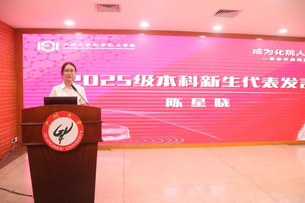 25级新生代表陈星晓分享了自己选择广大化院的原因,阐述大学四年的规划与专业使命,表明了她不负时代、为民族复兴贡献青春力量的决心。