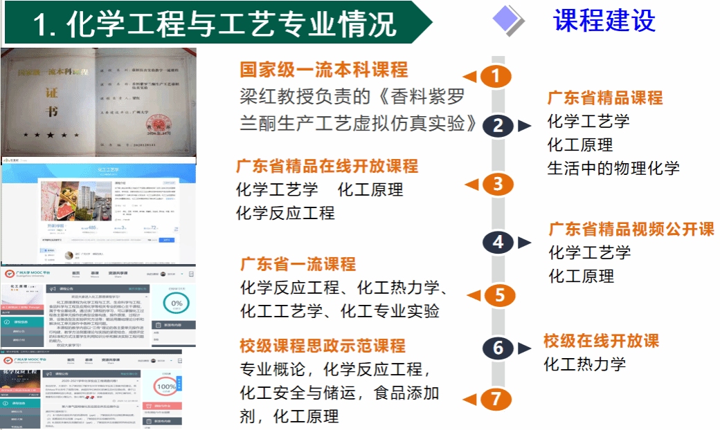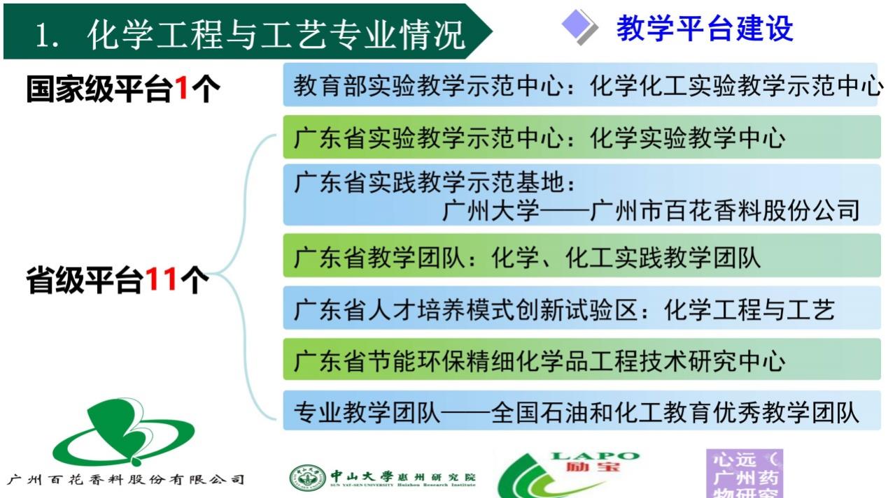 本专业所依托的化学工程与技术学科为省优势重点学科,拥有国家高等学校化学化工实验教学示范中心、省工程技术中心、广州百花香料股份有限公司省级工程实践教育中心、省级产学研实践基地等平台。拥有国家虚拟仿真实验教学一流课程1门,化学工艺学、化学反应工程、化工专业实验和化工热力学省级一流课程4门,化工原理、化学工艺学和化学反应工程等省级精品或在线开放课程3门,省级课程思政示范课堂1门。本专业所在单位是国家教育部化工类专业教学指导委员会委员单位,广东省化工与制药类专业教学指导委员会副主任单位,中国化工学会常务理事单位、广东省高校化学化工学会理事长单位。