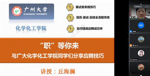 邀请优秀校友、广州纺织工贸企业集团有限公司党委副书记丘海澜女士与毕业生“云”谈就业,分享面试、就业经验。学院党委周海兵书记、李睿贤副书记,就业辅导员吴镇宣老师和毕业生们共同参与了分享会。