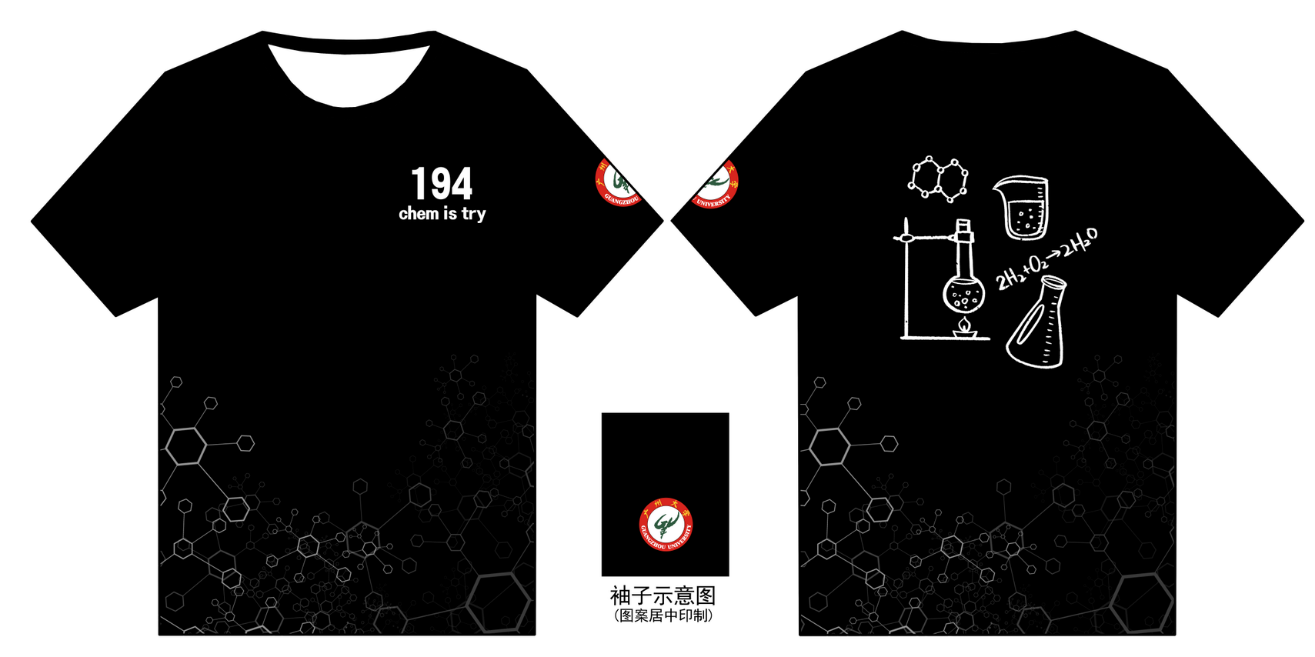 班服以黑色为底,白色为辅,前边的194和chem is try,寓意我们将走向新的转折点,在未来的四年里以饱满的精神投入到大学生活中去。背面的化学仪器寓意今朝化学器材在我们手中翻舞,明日我们将把化学带上讲台,带给我们的下一代。