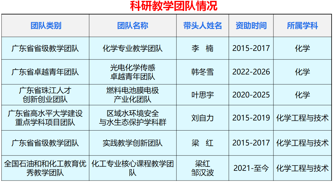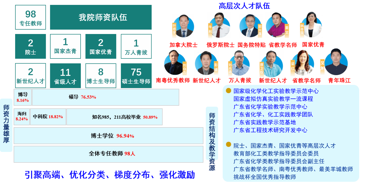 学院现有教职工131人,其中专任教师92人,专任教师中有博士学位者89人,博士导师8人,硕士导师74人。拥有外籍院士2人、国家杰青1人,优青2人,中组部万人计划青年拔尖人才1人、教育部新世纪人才2人、广东省教学名师2人、南粤优秀教师1人、教育部化工类教学指导委员会委员1人、广东省化学类教学指导委员会委员1人,省级人才14人,拥有6个省级教学科研团队。