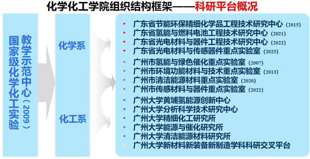 黄埔氢能源创新中心、实验中心、分析测试中心四个重要教学科研中心,并设有能源与催化研究所、精细化工研究所、清洁能源材料研究所三个院级研究机构。拥有国家级化学化工实验教学示范中心、广东省化学实验教学示范中心、广东省实践教学示范基地、广东省联合培养研究生示范基地等多个教学及实践平台,拥有广东省节能环保精细化学品工程技术研究开发中心、广东省氢能与燃料电池工程技术研究中心、广东省光电材料与器件工程技术研究中心、广州市氢能与绿色催化、环境功能材料与技术、清洁能源材料、传感材料与器件重点实验室等多个省市级重点科研平台。拥有价值1.38亿元的仪器设备和近1.2万平方米的实验用房及丰富的化学化工专业文献数据资源。