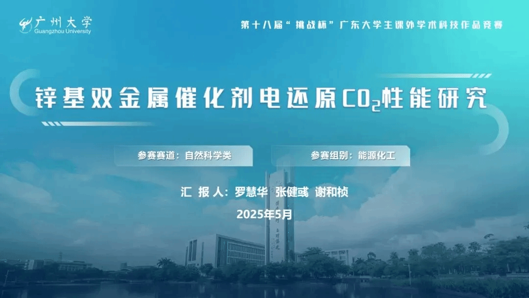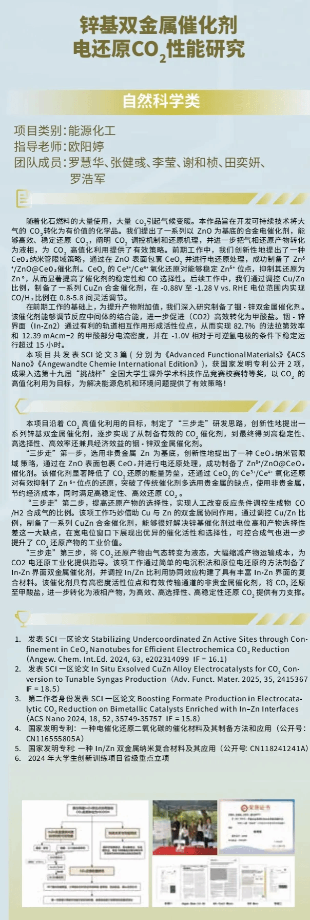 本项目针对全球气候变暖及CO₂减排的重大挑战,围绕锌基双金属催化剂的设计合成与CO₂电还原性能开展系统性研究,着力解决传统催化剂成本高、活性位点不稳定、CO₂活化难等关键问题。通过双金属协同改性与微结构调控策略,成功开发三类高效催化剂体系:以空心核壳结构的CeO2稳定不饱和配位锌活性位点、通过原位溶出技术制备CuZn合金催化剂,调控Cu/Zn比例使合成气中CO/H₂比例在0.8-5.8区间可调、构建InZn双位点催化剂,通过界面工程降低CO₂活化能垒,相关成果发表3篇高质量论文。项目形成“理论研究-材料创制-应用转化”完整链条,获2项国家发明专利公开及2024年大学生创新训练项目省级重点立项,为CO₂资源化利用及“碳中和”目标提供了实验支撑。
