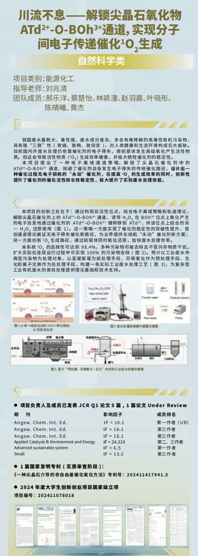 本项目提出了一种电子离域通道策略,解锁了尖晶石催化剂中的ATd2+-O-BOh3+通道,规避了催化剂自身发生电子得失的传统催化路径,设计出一种催化过程无电子损耗的“永动”催化剂,在提高1O2的生成效率的同时,创新性提升了催化剂的催化活性和长效稳定性,极大提升了实际废水处理效能。