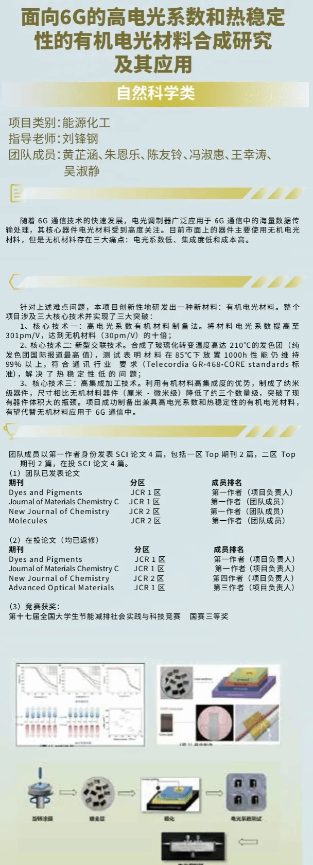 面向6G技术进行先研探索正在进行,相对5G通信,未来6G通信必然对带宽、信息传输速度提出更高的要求。一方面,目前广泛应用于5G通信的电光调制器传统核心部件铌酸锂电光系数为30pm/V,明显无法满足6G时代带宽、响应及传输速度等方面更快更高的要求;另一方面,现有材料本身的性质导致集成度较低,加工技术繁琐,成本高昂等问题,也制约着6G通信技术的进一步发展。在此背景下,更加迫切开发具有高性能的有机电光材料,代替传统材料,实现通讯行业的高速发展。