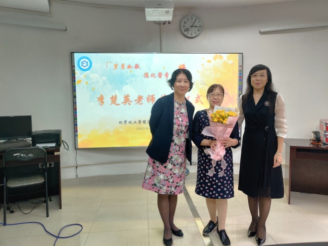 仪式上,分工会主席郭云萍老师为荣退教师送上鲜花及退休礼物,周海兵书记为李楚英老师赠送化院院徽纪念章,李老师也幸运地成为了院徽纪念章的第一个拥有者。